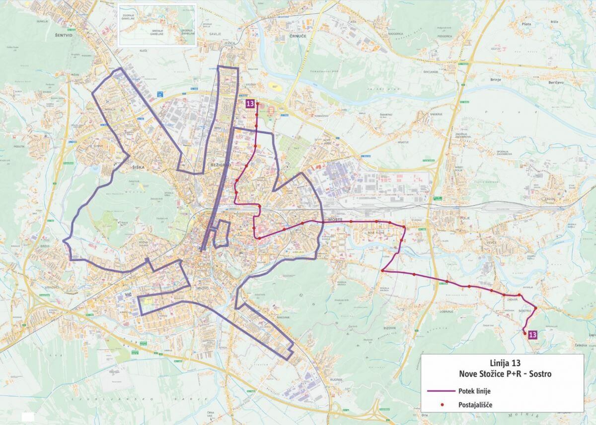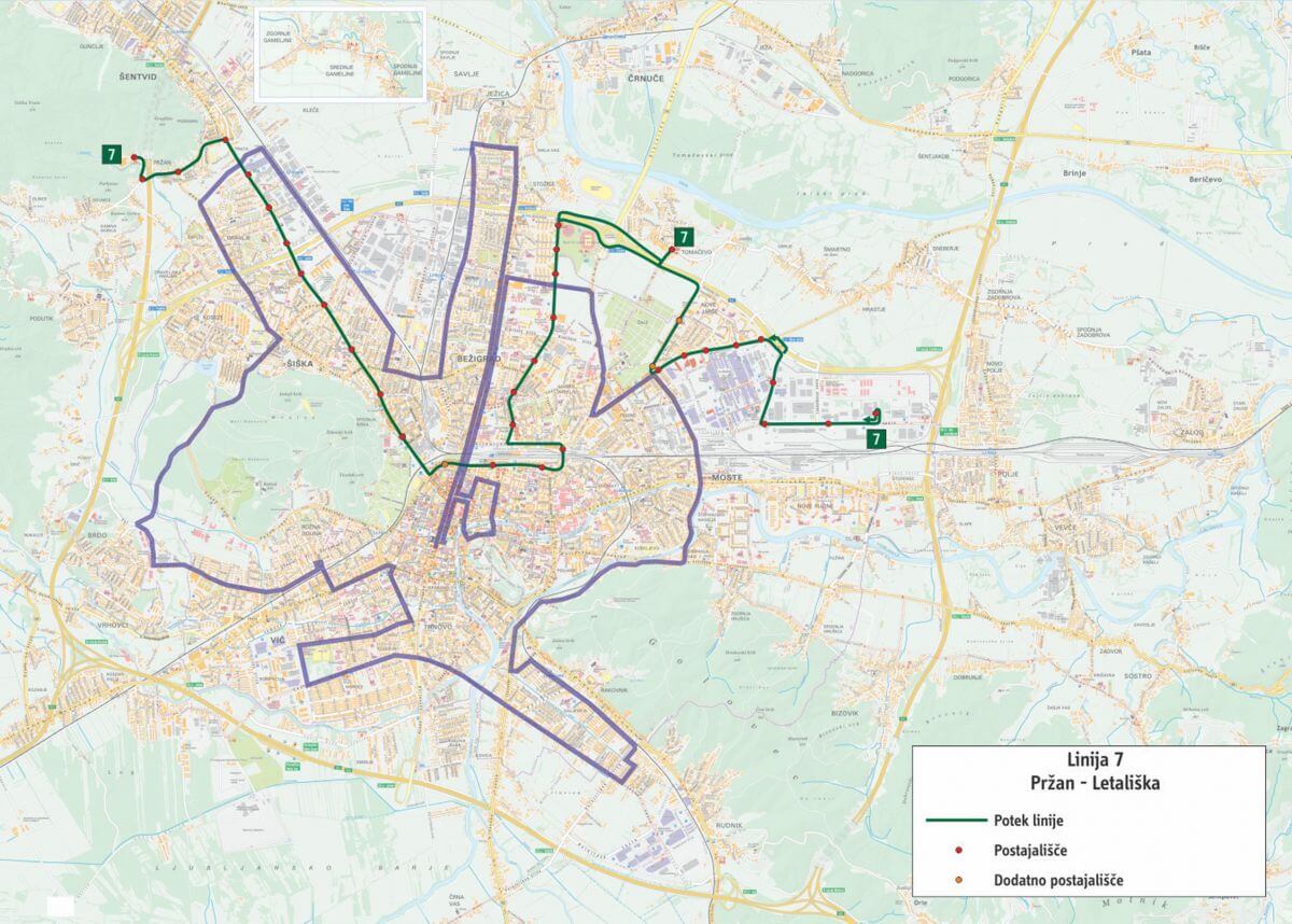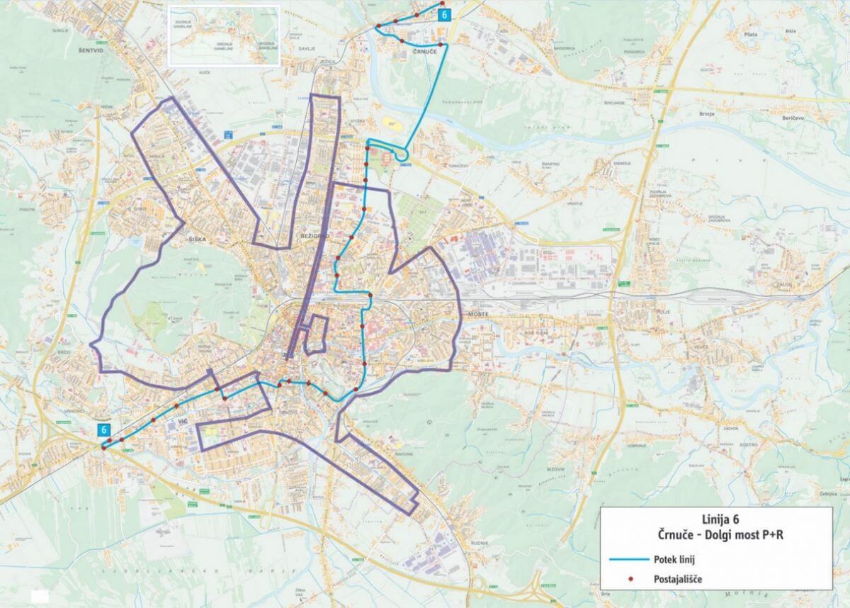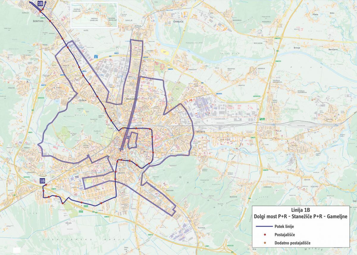 Iz smeri Brod – Stanežiče P+R: Celovška cesta (prečenje v križišču z Pečnikovo ulico), Tivolska cesta (prečenje v križišču s Slovensko cesto), Masarykova ulica, Njegoševa ulica, Roška cesta, Karlovška cesta, Zoisova cesta (omogočeno zavijanje levo na Barjansko cesto), Barjanska cesta (prečenje Kopačeva ulica), Cesta dveh cesarjev, Cesta v Gorice, Dolgi most P+R in enako v obratni smeri do Stanežiče P+R – Brod.
