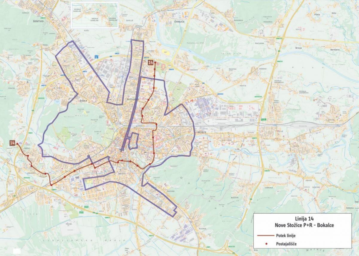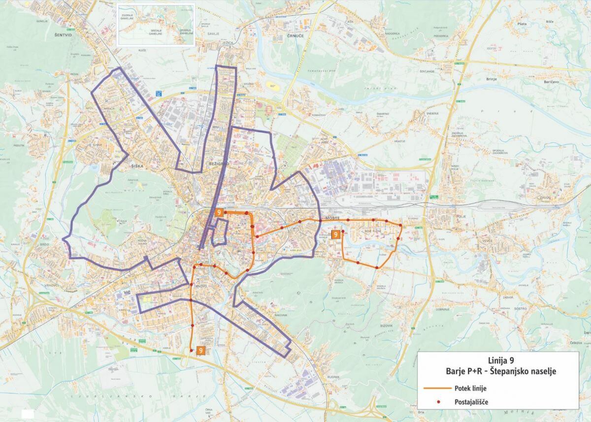 Iz smeri Barje P+R: Barjanska cesta (prečenje Kopačeva ulica, omogočeno zavijanje desno na Zoisovo cesto), Zoisova cesta, Karlovška cesta, Roška cesta, Njegoševa ulica, Masarykova ulica, Trg OF, Masarykova ulica, Njegoševa ulica, Zaloška cesta (prečenje v križišču z Kajuhovo cesto), Chengdujska cesta, Fužinska cesta, Litijska cesta, Pesarska cesta (obračališče Štepanjsko naselje) in enako v obratni smeri.