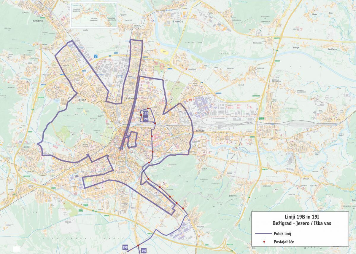 Iz smeri Iška vas - Barje: Ižanska cesta oz. Črnovaška cesta, Peruzzijeva ulica, nakupovalno središča Rudnik, Lorenzova ulica, Dolenjska cesta, Roška cesta, Njegoševa cesta, Masarykova cesta, Šmartinska cesta, Vilharjeva cesta, Železna cesta, Linhartova cesta, Topniška ulica, Šmartinska in naprej po obvozni trasi v smeri Iška vas oz. Jezero.