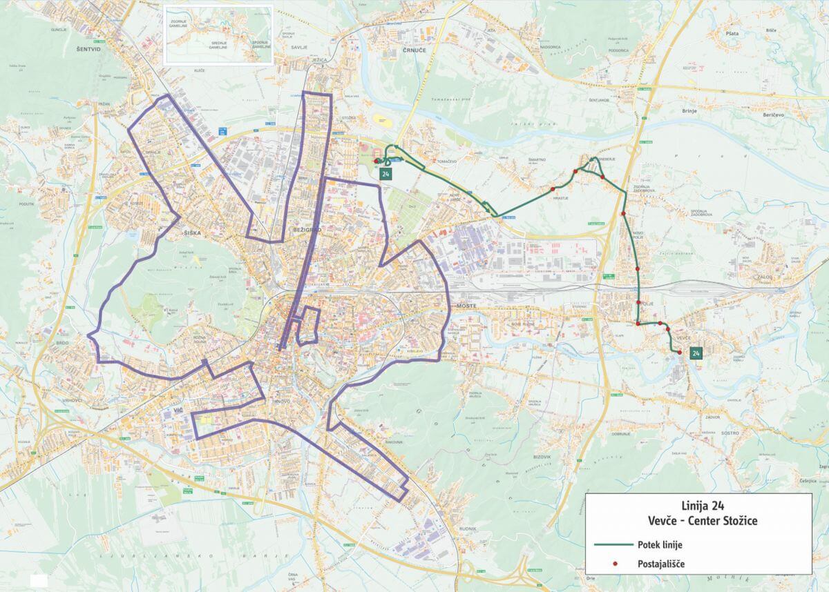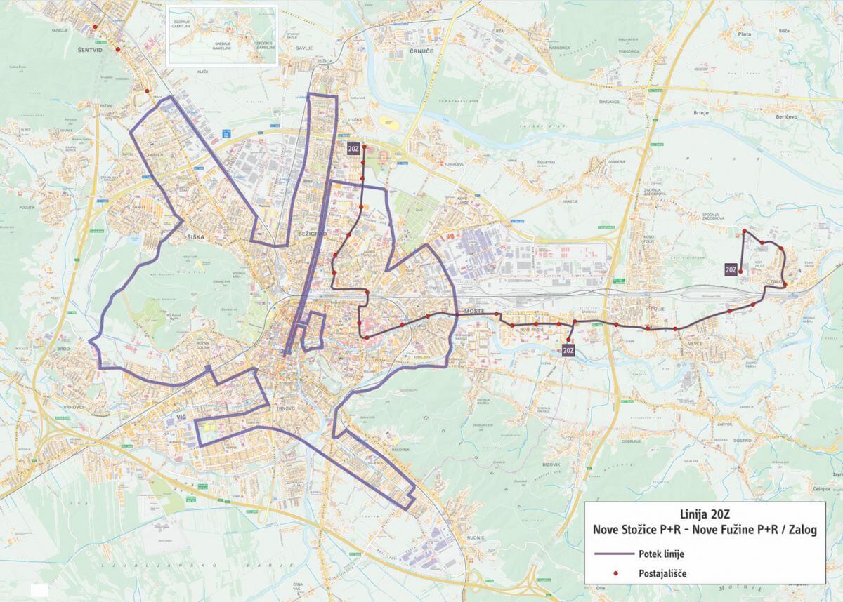 Iz smeri Sostro: Litijska cesta, Fužinska cesta, Chengdujska cesta, Zaloška cesta (prečenje v križišču z Kajuhovo cesto), Njegoševa cesta, Masarykova cesta, Šmartinska cesta, Vilharjeva cesta, Železna cesta, Vojkova cesta (prečenje v križišču z Božičevo ulico), obračališče linije 20 Nove Stožice in enako v obratni smeri.