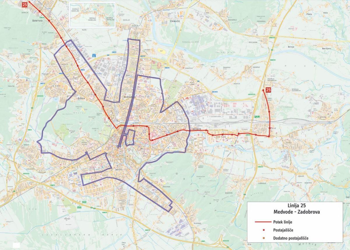 Iz smeri Medvode: Celovška cesta (prečenje v križišču z Pečnikovo ulico oz. Ulico Jožeta Jame), Tivolska cesta (prečenje v križišču s Slovensko cesto), Masarykova ulica, Njegoševa cesta, Zaloška cesta (prečenje v križišču z Kajuhovo cesto), redna trasa in enako v obratni smeri.