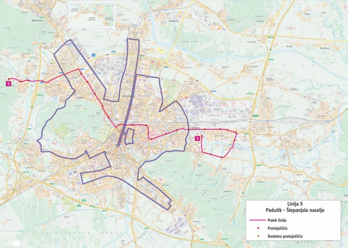 Iz smeri Podutik: Podutiška cesta, Ljubljanska severna obvoznica, Celovška cesta, Tivolska cesta (prečenje v križišču s Slovensko cesto), Masarykova ulica, Njegoševa ulica, Zaloška cesta, Chengdujska cesta, Fužinska cesta, Litijska cesta, Pesarska cesta (obračališče Štepanjsko naselje) in enako v obratni smeri.